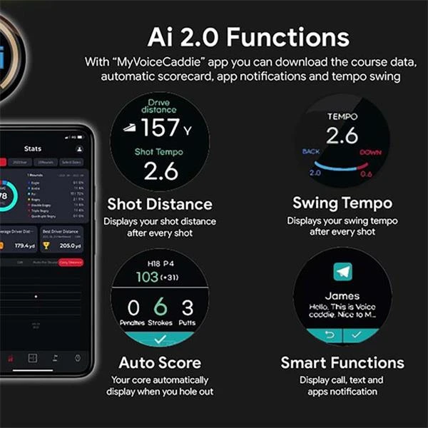 The T8 is the most advanced, ultra-premium smart golf GPS watch that VOICE CADDIE has ever made! The T8 comes equipped with a color touchscreen, gives yardages to the green front/center/back, and offers advanced features such as Active Green™ (improves accuracy), V-Algorithm™(slope calculation), green undulation (indicated with heat map and arrows show break direction), putt view (shows elevation and distance to pin) smart green (touch pin-placement), course views (yardages to hazards and bunkers).